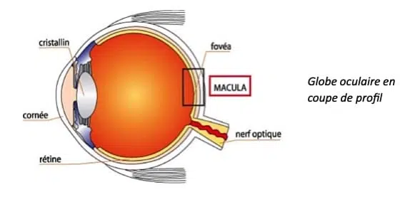 - La macula est la partie centrale de la rétine, située dans l’axe optique, très dense en cellules visuelles et qui permet la vision fine